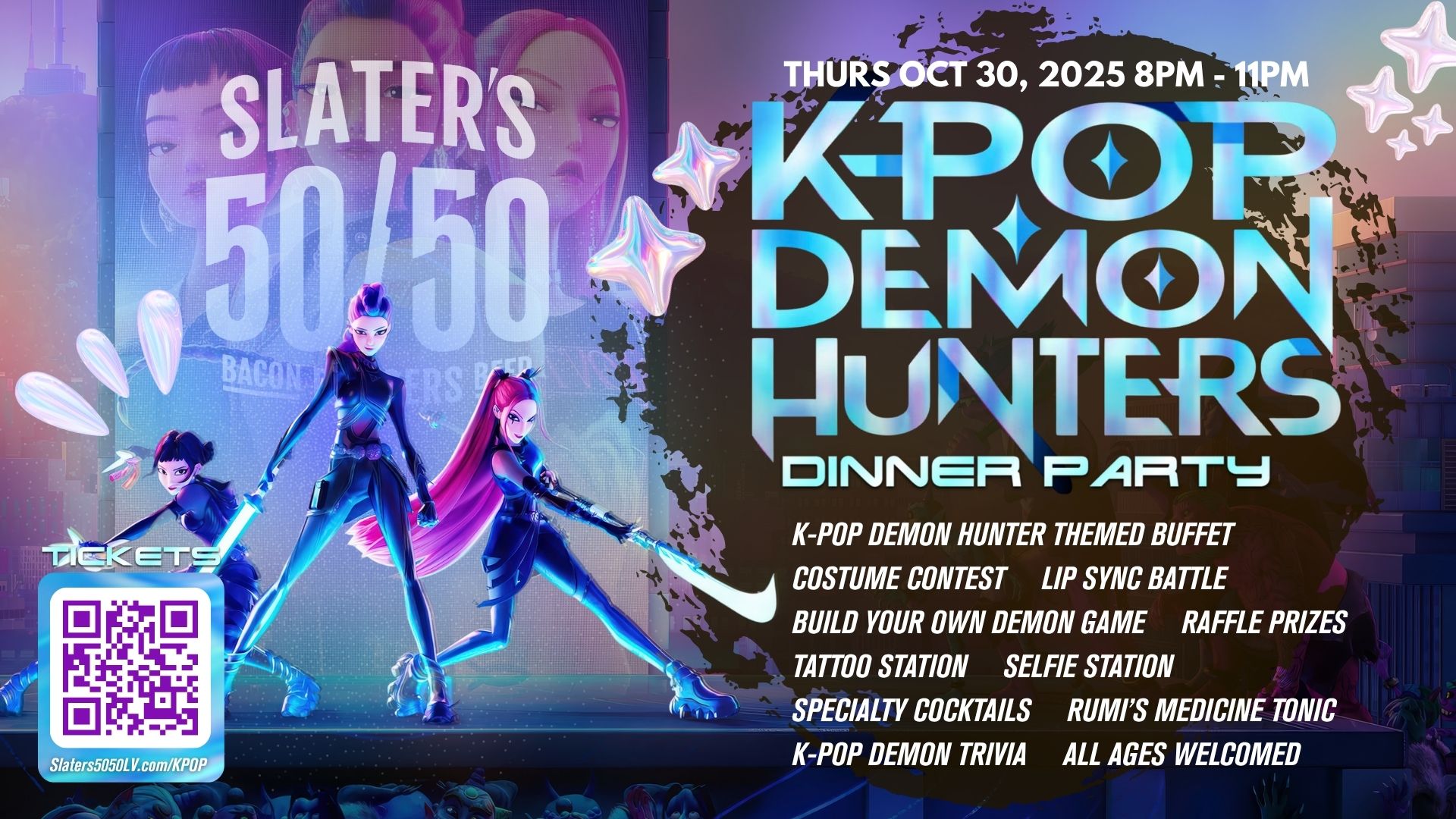 Join us the night before Halloween for The K-Pop Demon Hunters Dinner Party, an immersive dining and fandom event that fuses high-energy K-Pop culture, anime-style demon-slaying flair, and over-the-top Slater’s flavor.